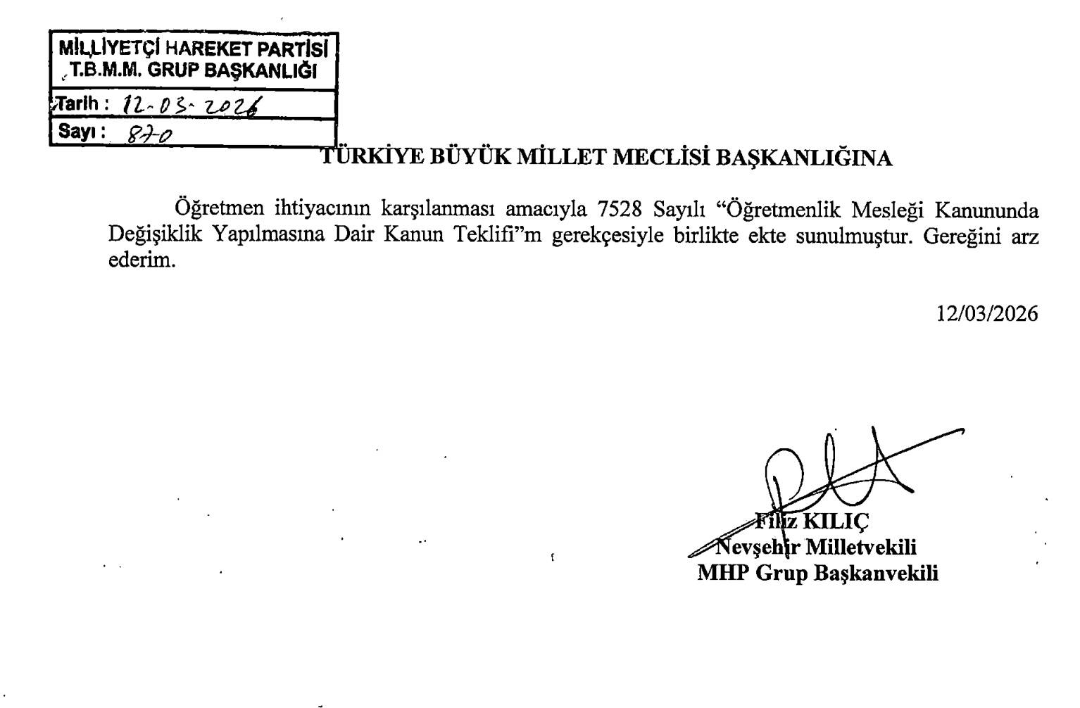 MHP Grup Başkan Vekili Filiz Kılıç ,1611 mülakat mağduru öğretmenin atanmasına yönelik bir kanun teklifi önergesi verdi.